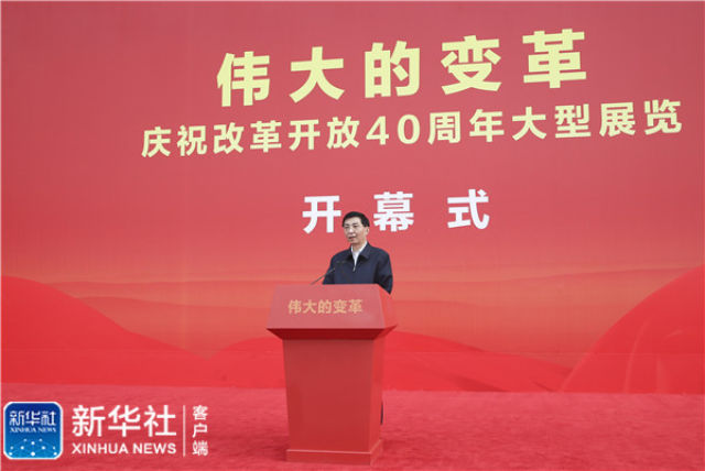 据新华社电“伟大的变革——庆祝改革开放40周年大型展览”开幕式13日上午在国家博物馆举行。中共中央政治局常委、中央书记处书记王沪宁发表讲话并宣布展览开幕。