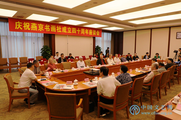 燕京书画社创始人之一王成喜,清华大学美术学院教授、齐白石艺术研究会副会长李燕,中国美协理事、北京美协副主席李耀林,原全国政协常委、原北京市副市长孙安民,原东城区政协主席邵鹏,北京宣传部原巡视员、中宣部阅评专家孙玉山等嘉宾与燕京书画社领导石占成、常荣菂、赵青仲出席会议,座谈会在欢快热烈的气氛中进行,大家畅所欲言,回顾了燕京书画社四十年来的发展历程,对燕京书画社的奋斗目标提出诚恳的建议和美好的祝愿。
