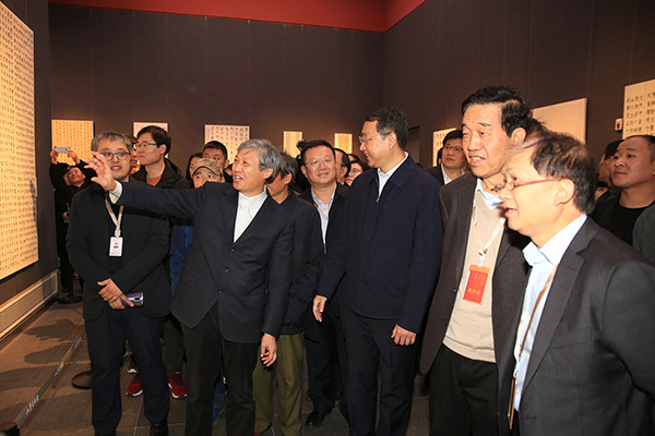 11月10日,“全国第十二届书法篆刻展览篆书篆刻刻字展”在山东美术馆拉开帷幕。图为领导和嘉宾参观展览。