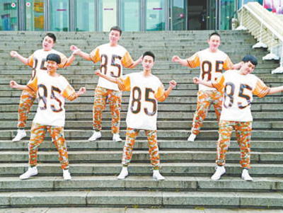 北京“铁军”健身操舞队的90后男青年在训练参赛舞蹈